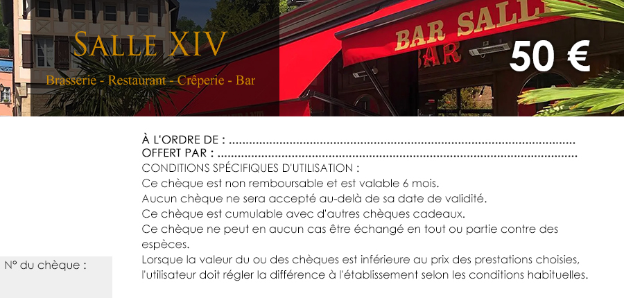 Offrez un moment gourmand unique avec les chèques cadeaux de la Brasserie Salle XIV, située à Joinville, près de Saint-Dizier en Haute-Marne (52). Parfait pour toutes les occasions – anniversaire, Noël, fête des mères ou des pères, Saint-Valentin –, les bons cadeaux du restaurant Salle XIV s’adapte à vos envies et à celles de vos proches.